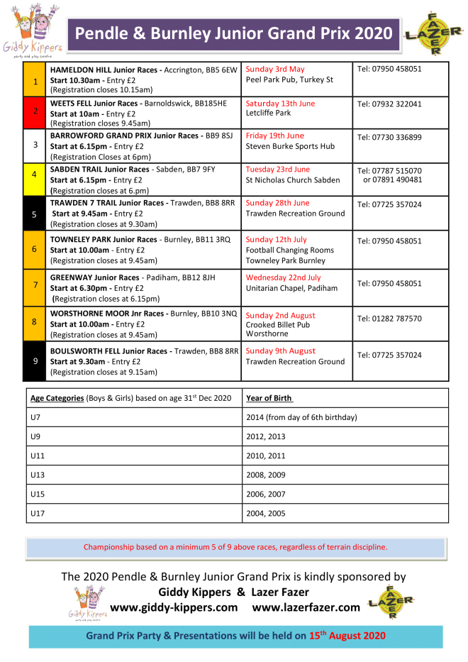 Here are the details of the 2020 Junior Pendle and Burnley Grand Prix Championships, sponsored by Giddy Kippers and Lazer Fazer!