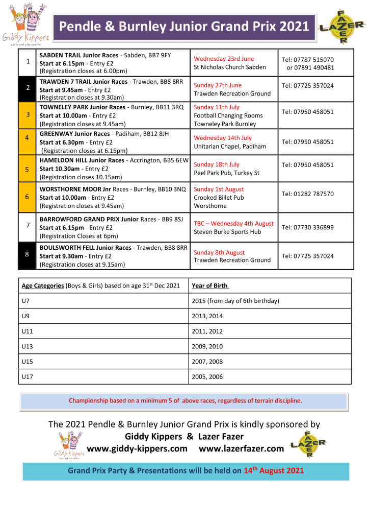 Here are the details of the 2021 Junior Pendle and Burnley Grand Prix Championships, sponsored by Giddy Kippers and Lazer Fazer!